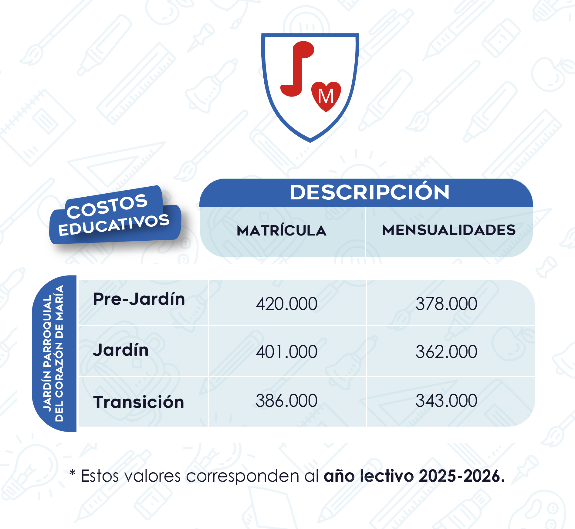 Estos costos hacen referencia al presente año lectivo 2024-2025. Tendrán un incremento el próximo año de acuerdo a lo que apruebe Secretaría de Educación. Por favor tomarlos como un referente.