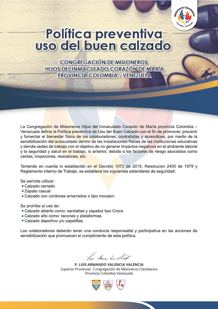 Queridos colaboradores claretianos, los invitamos a seguir con responsabilidad los lineamientos de nuestro Reglamento Interno de Trabajo y la política interna del buen calzado, pues su conocimiento y apropiación nos ayudarán a mantener un ambiente seguro y saludable en sus áreas de trabajo mientras que continuamos alcanzando nuestras metas como Familia Claretiana.